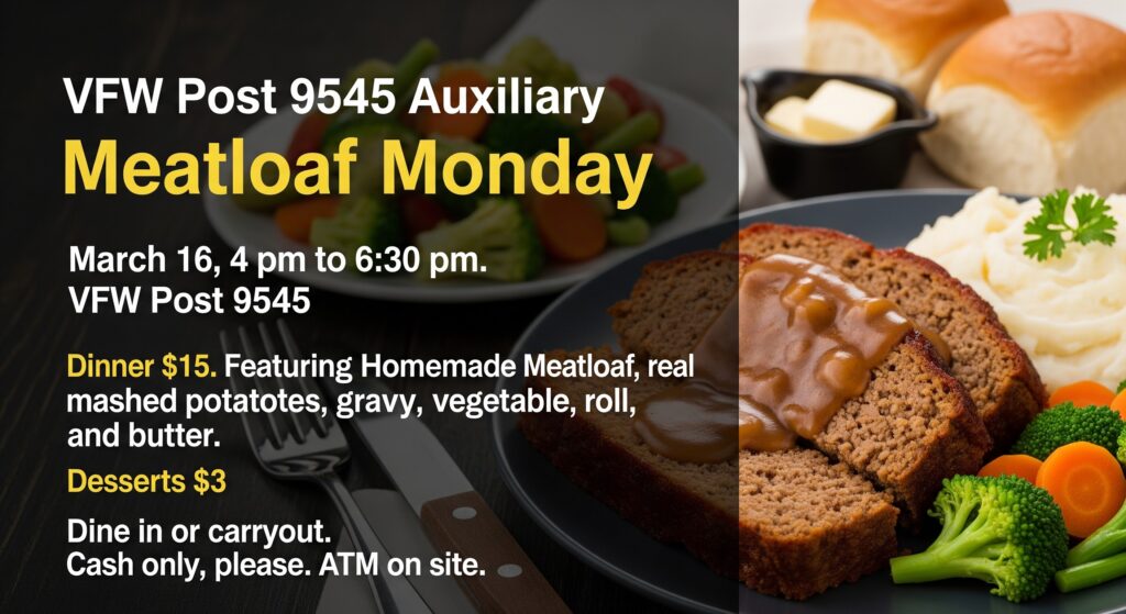 Every 3rd Monday of the month is Meatloaf Monday at VFW Post 9545. Enjoy Homemade Meatloaf, REAL mashed potatoes (with lumps) & gravy, vegetables, and bread with butter. Desserts are available for $3. Dine-in the bar or carry-outs are available. All dinners are $15. Dinner is 4 pm-6 pm unless we run out. It goes fast, so get in early. Save time and phone in your carryout order starting @ 2 pm. 815.485.8369