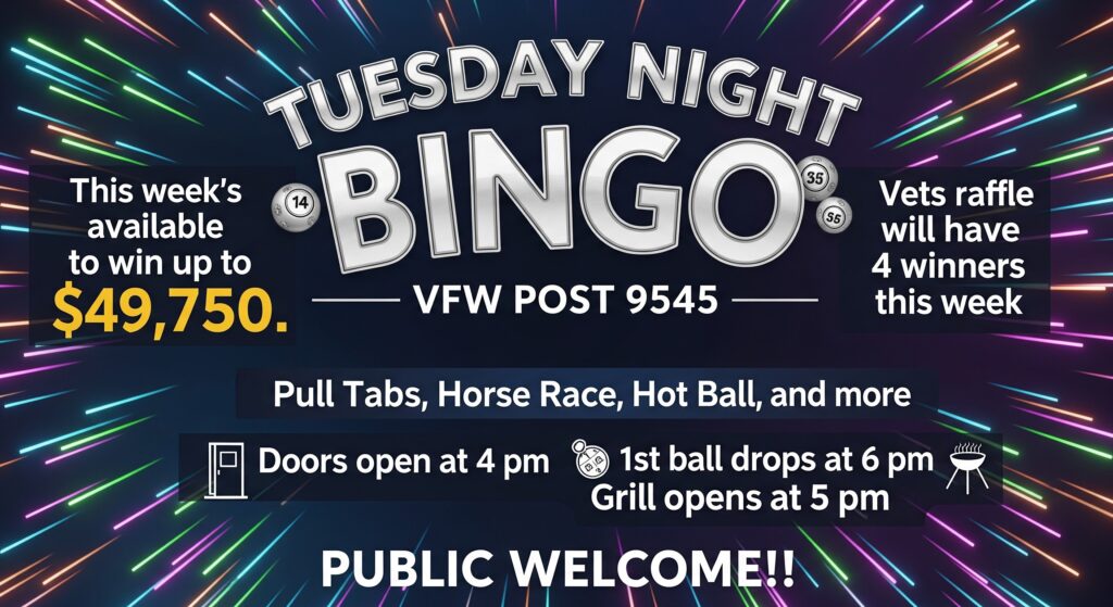 In 2024, our Tuesday Night Bingo paid $288,153.00 in cash prizes, including Bingo, Raffles, and Pull Tabs. Congratulations!!