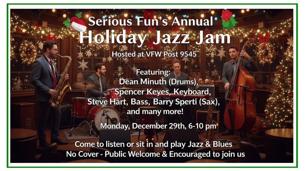 Annual Holiday “Jazz Jam” featuring “Serious Fun” Monday, December 29th, 6pm-10pm. Public Welcome (Especially Musicians) and NO COVER!