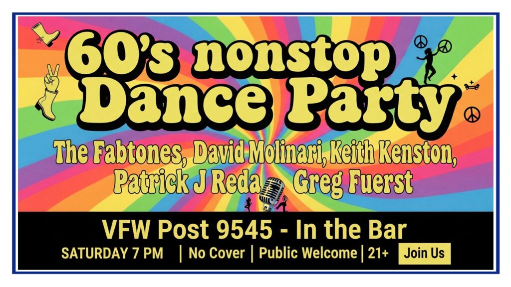 Saturday Night March 21, 2026, Playing In The Bar. “The Fabtones.” Playing a 1960s Dance Tribute. 7 pm. No Cover, Public Welcome, 21+