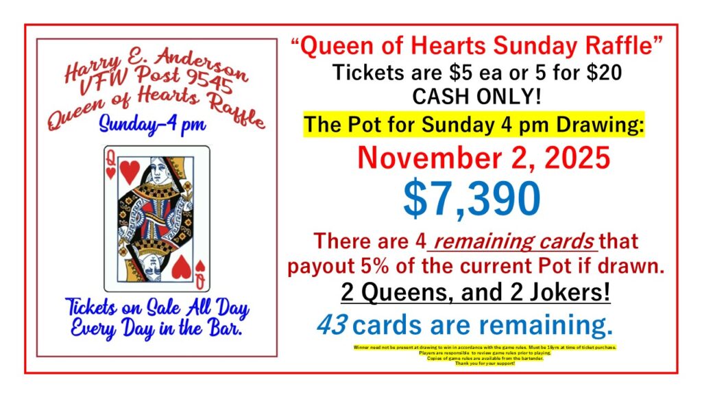 We have replaced the Jackpot raffle with the “Queen of Hearts raffle!” Many more ways to win. Tickets are still $5 ea. or 5 for $20. But the good news is that they are on sale in the bar from 5 pm Sunday every day until 3:45 pm the following Sunday. They are also sold at Tuesday Night Bingo & Friday Fish Fry. The winner need not be present to win*. Ticket purchase serves as evidence of the Player’s Agreement to the game rules. Please take a look at the game rules below for details and additional ways to win.