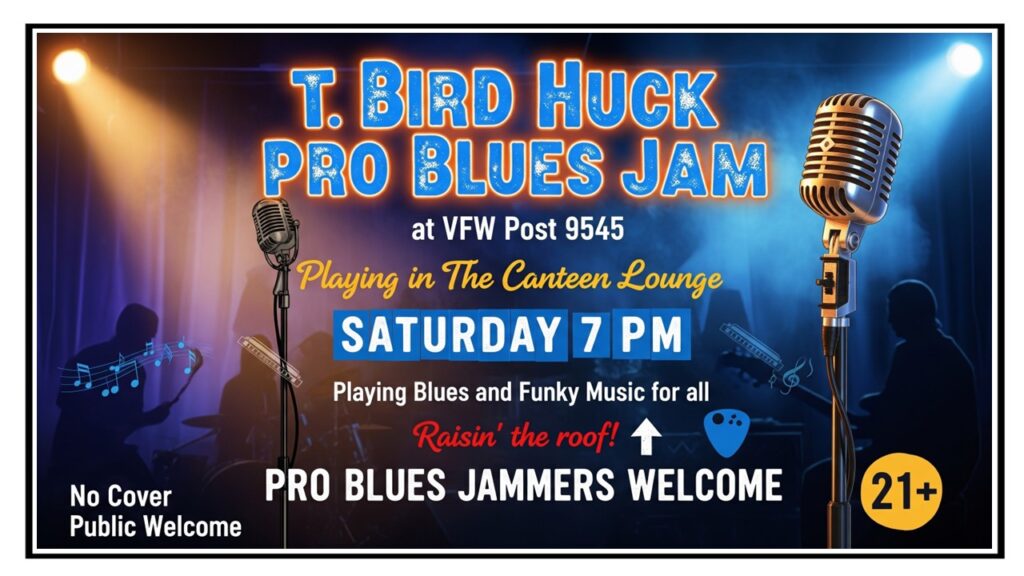 T-Bird Huck Pro Blues Jam Playing In The Bar on Saturday, April 4, 2026. NO COVER, PUBLIC WELCOME 21+