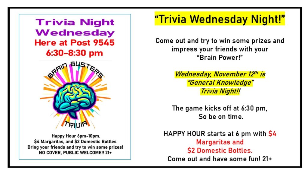 Come out and give it a try. There will be prizes to win, and Brain Busters will run the show. Bring your friends and have some “Friendly Competition!”