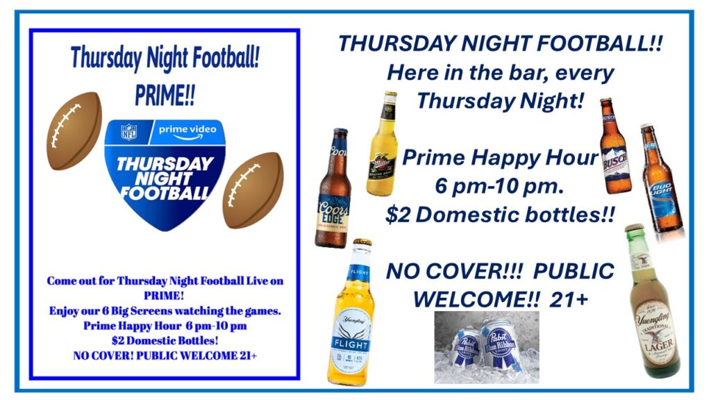 Come out and watch Thursday Night Prime Football ON OUR 6 BIG SCREEN TVs. Full Sound!! Happy Hour: 6 pm – 10 pm, $2 Domestic Bottles.