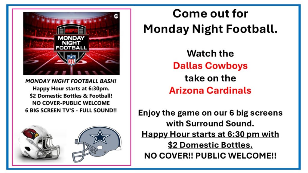 Happy Hour starts at 6:30 pm. $2 Domestic bottles and great football as the Dallas Cowboys take on the Arizona Cardinals!