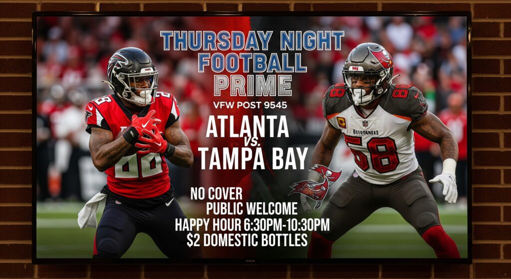 Come out and watch Thursday Night Prime Football ON OUR 6 BIG SCREEN TVs. Full Sound!! Happy Hour: 6 pm – 10 pm, $2 Domestic Bottles.